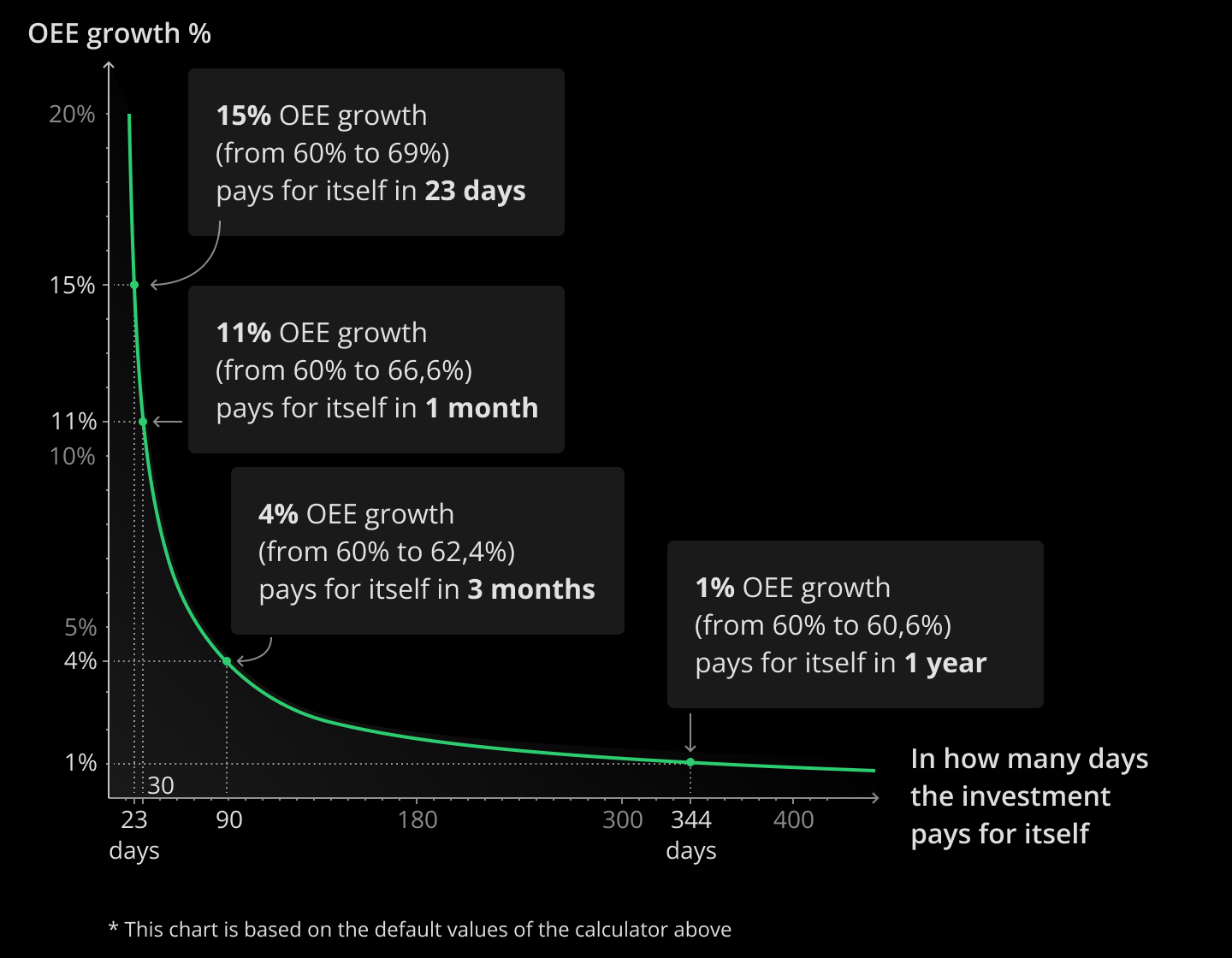 Although our calculator shows ROI on a per annum basis, the initial investment usually pays for itself within 4 months. And that’s in case your baseline OEE is at 60% and you see only growth of +2,5%.